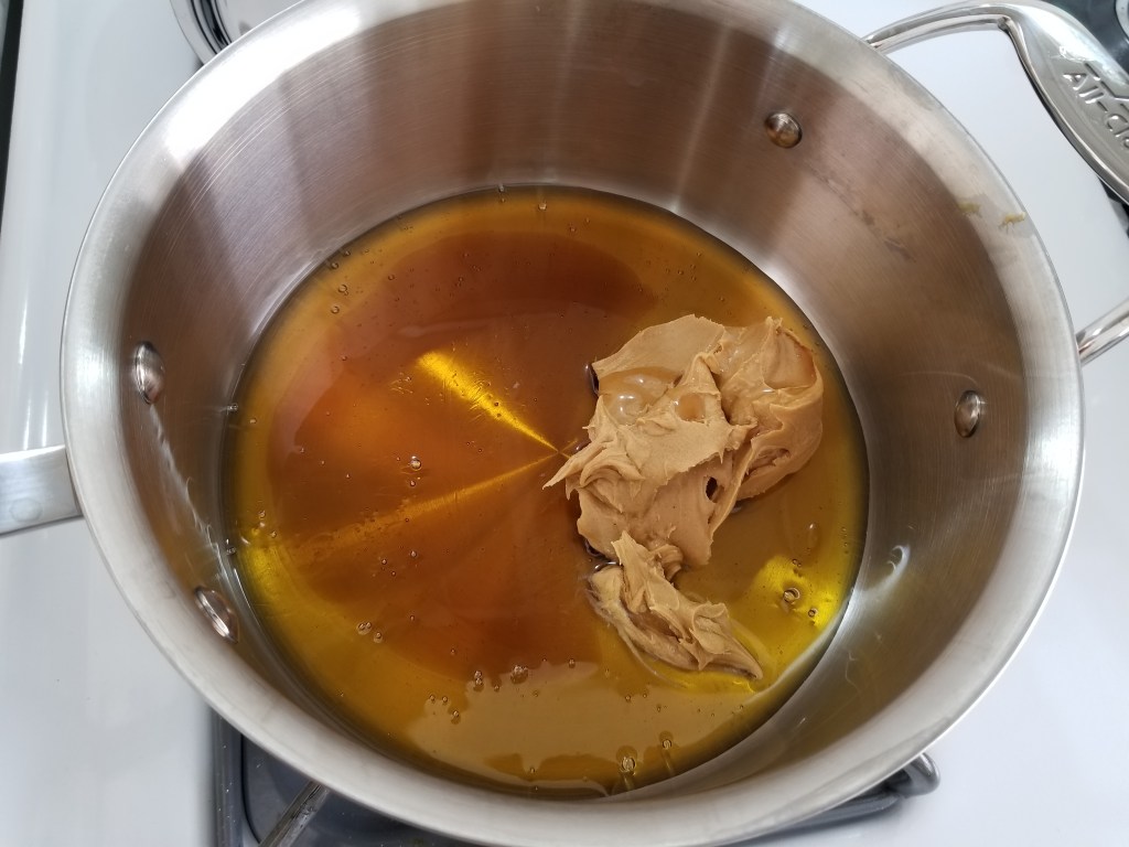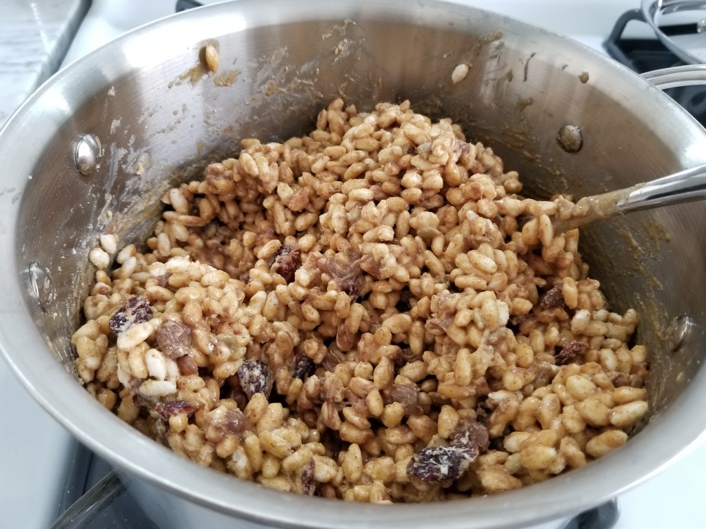 Once the peanut butter, maple syrup, and honey were heated to the point where they mixed evenly, I added in the cinnamon. Then I let the mixture cool for about 10 minutes before adding in the other ingredients, including puff cereal, dried cranberries, and chocolate chips.