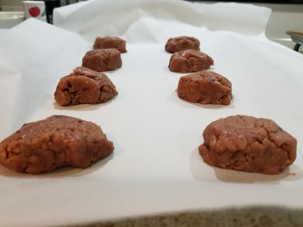 As with most baked cookie recipes, the wet ingredients and sugars were mixed in one bowl and the dry ingredients in another. They’re then combined and a large tablespoon was plopped onto the cookie sheets before being baked.