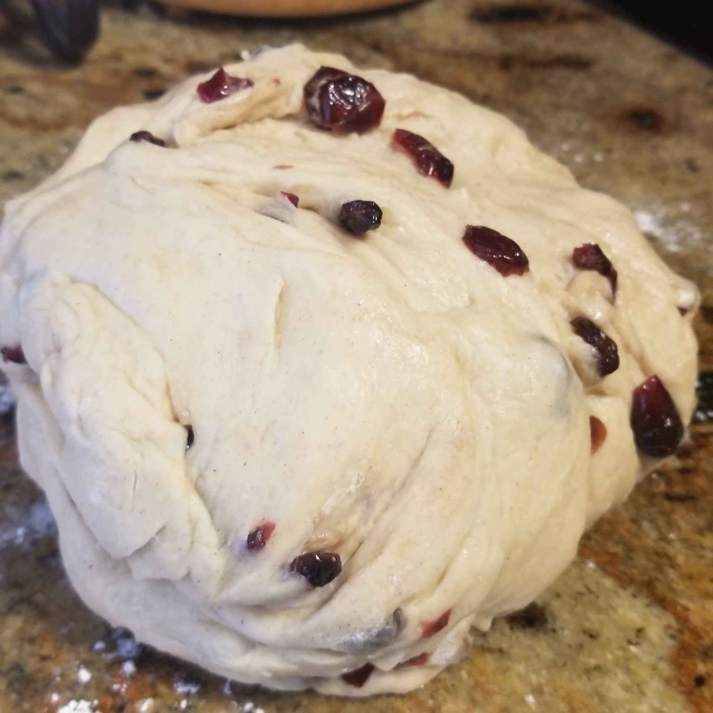 Then butter, dried cranberries and cinnamon are added and it’s mixed for another 5 minutes before being transferred to a greased bowl to rise until doubled.