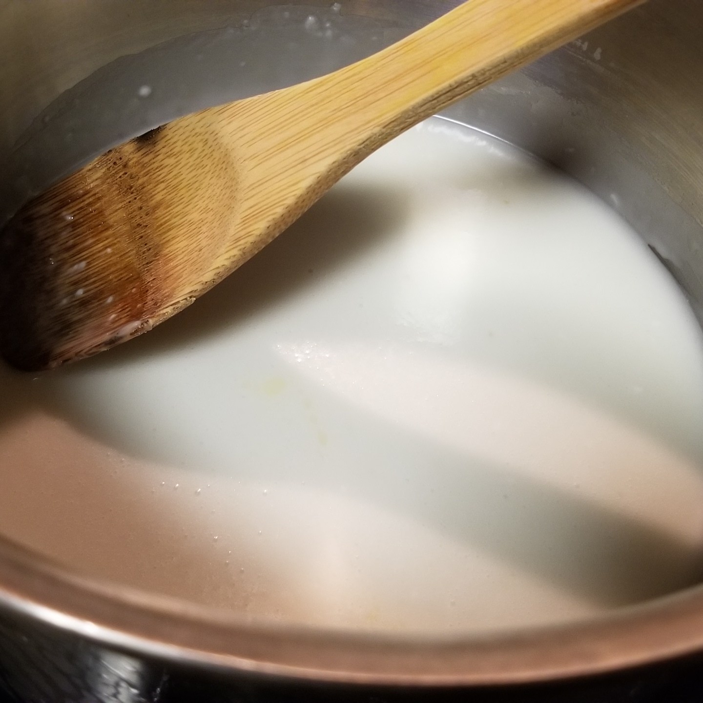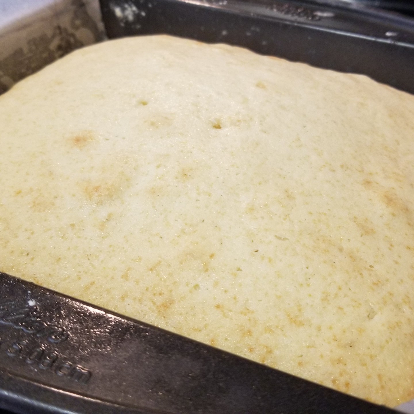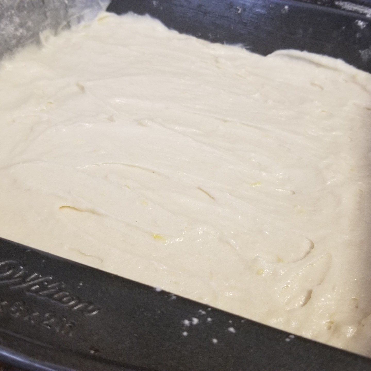 First the cake itself is made like most cakes – dry ingredients are mixed in one bowl and the wet in another (excluding milk). The dry ingredients and milk are added to the wet ingredients in batches until it’s completely combined. This is poured into a baking pan and baked until light gold.