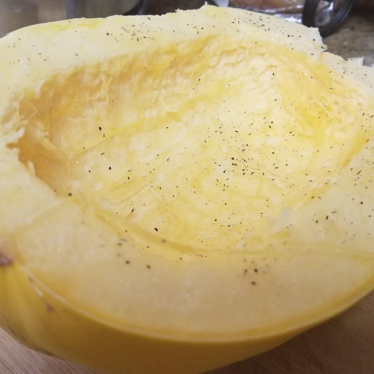 The squash is baked in the oven, and then shredded with a fork to look like spaghetti.