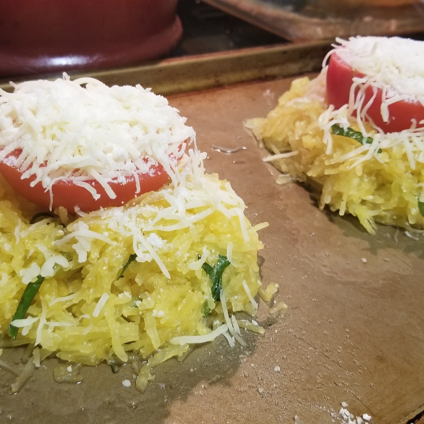 The squash is then mixed with olive oil, basil, garlic, and Parmesan and shaped into two piles on a baking sheet. These piles are topped with tomato halves, mozzarella, and more Parmesan.