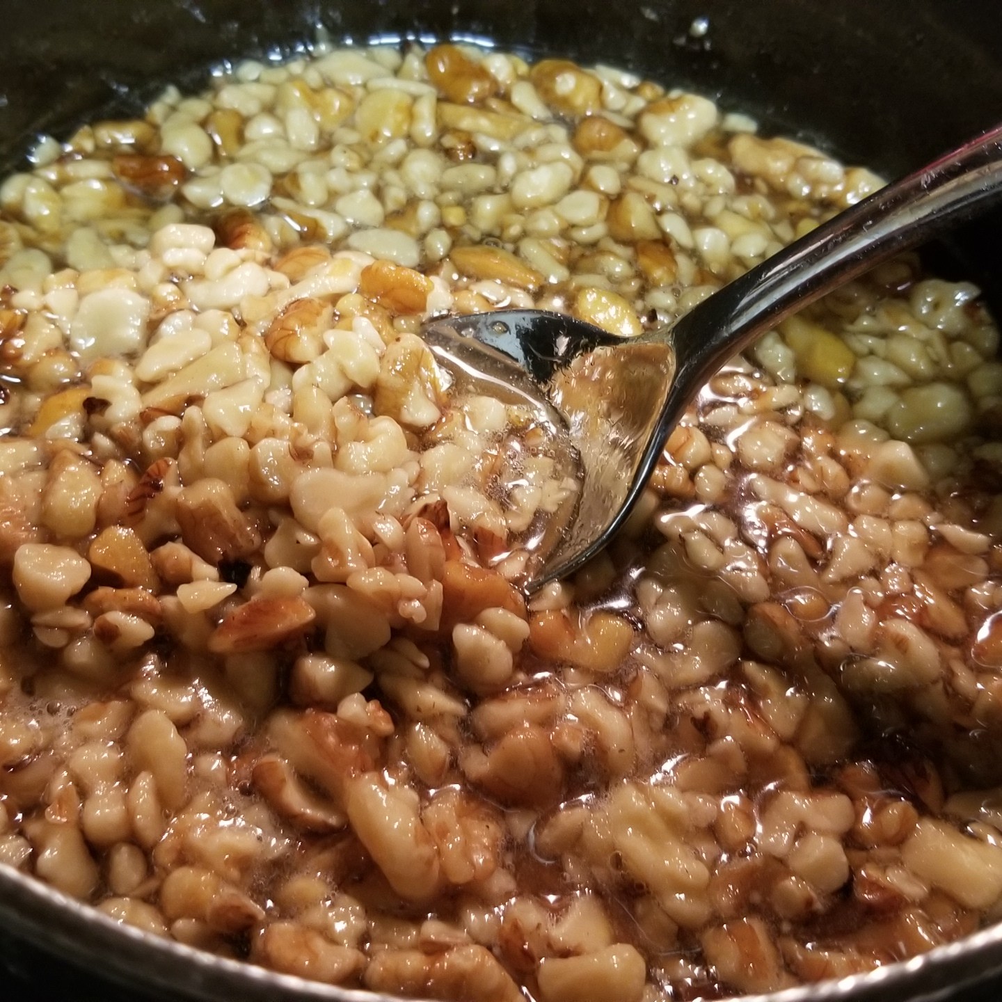 I made the “wet walnuts” first, since it doesn’t necessarily need to be warm when you eat it. Sugar and water are brought to a boil, maple syrup is added and cooked for a few minutes, and then walnuts are stirred in.