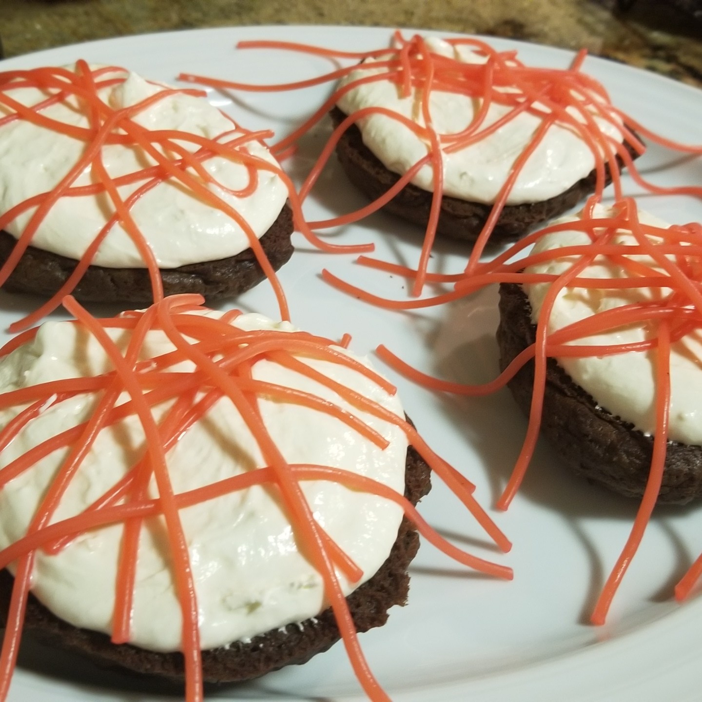 For assembly, the icing is spread onto the flat side of half the cakes. The cooled spaghetti is then placed on top of the icing so that it hangs over the sides of the cakes.