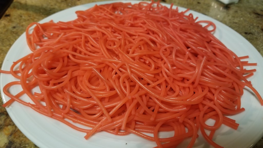 For the strawberry filling, the spaghetti is cooked like usual, but in water that has Jell-O mix powder mixed in. You will also need strawberry jam, though if you’re only going off the easier-to-understand version of the recipe in the back (vs. the Lovecraftian-language version in the main body of the cookbook) you might miss this – the strawberry jam is actually listed on the same page as the instructions, and not with the ingredients.