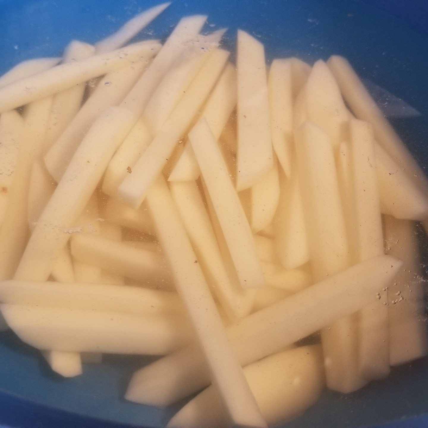 Once the potatoes are peeled, they are cut into long sticks and soaked in cold water to get rid of the extra starch. Be sure to dry thoroughly after soaking or the oil might sputter!