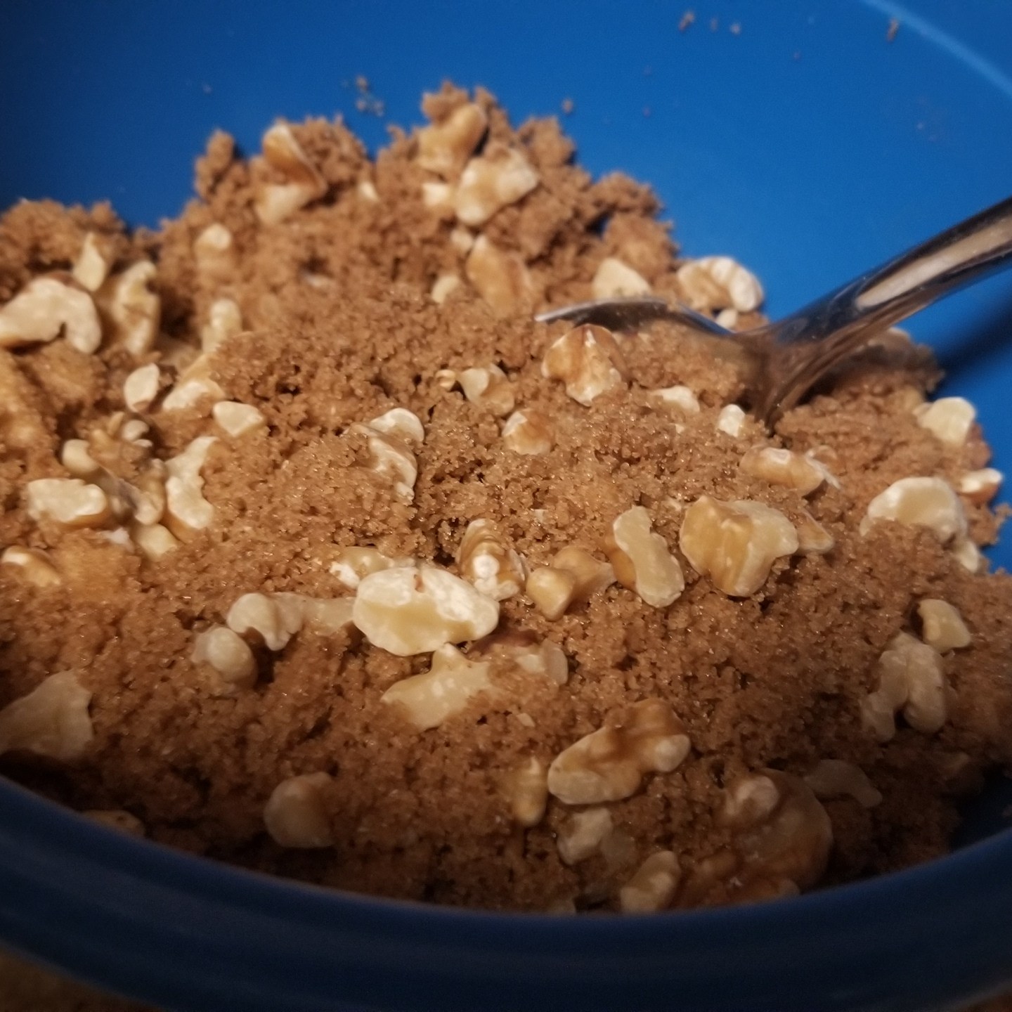 Next is the topping. Butter is cut into a brown sugar & cinnamon mixture, and then the nuts are mixed in. This is sprinkled over each of the cupcakes. It seemed like a lot of topping, but turned out to be a good amount. Although I will say, it did crumble quite a bit once they were out of the oven!