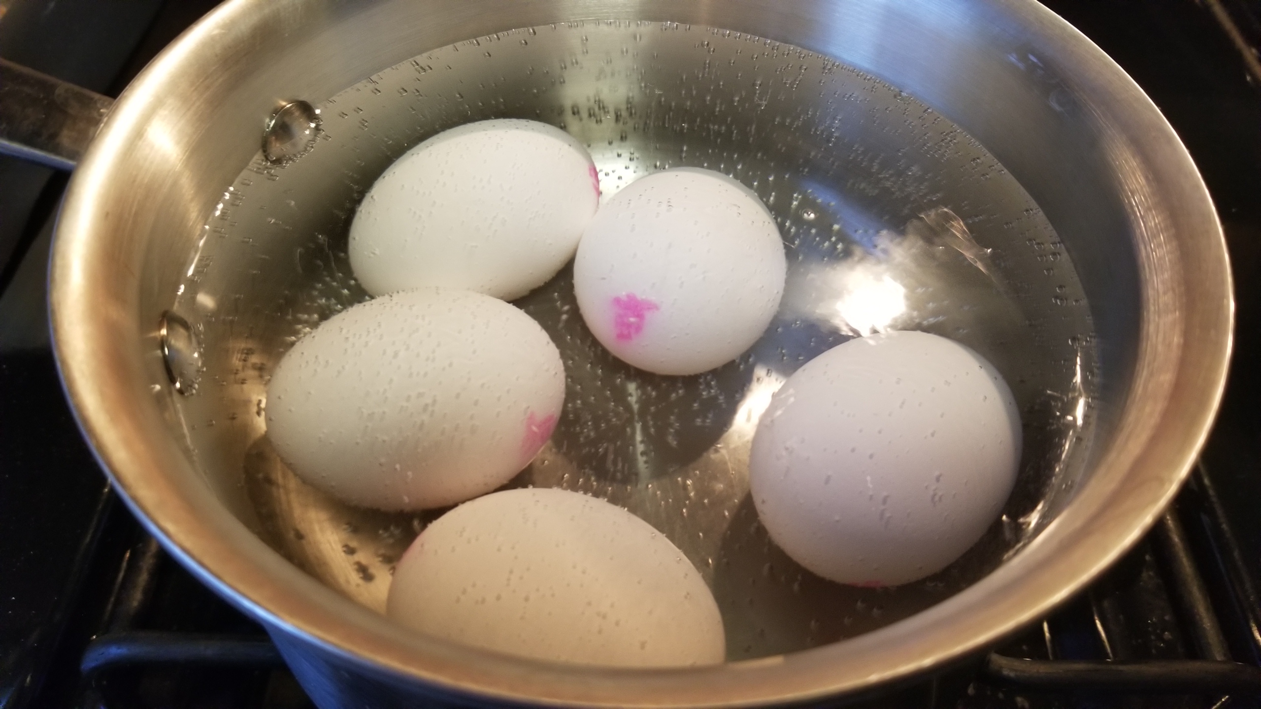 So…we all know how to hard boil eggs? Put eggs in pot, cover with water, bring to a boil, then turn off stove and let sit for 12 minutes.