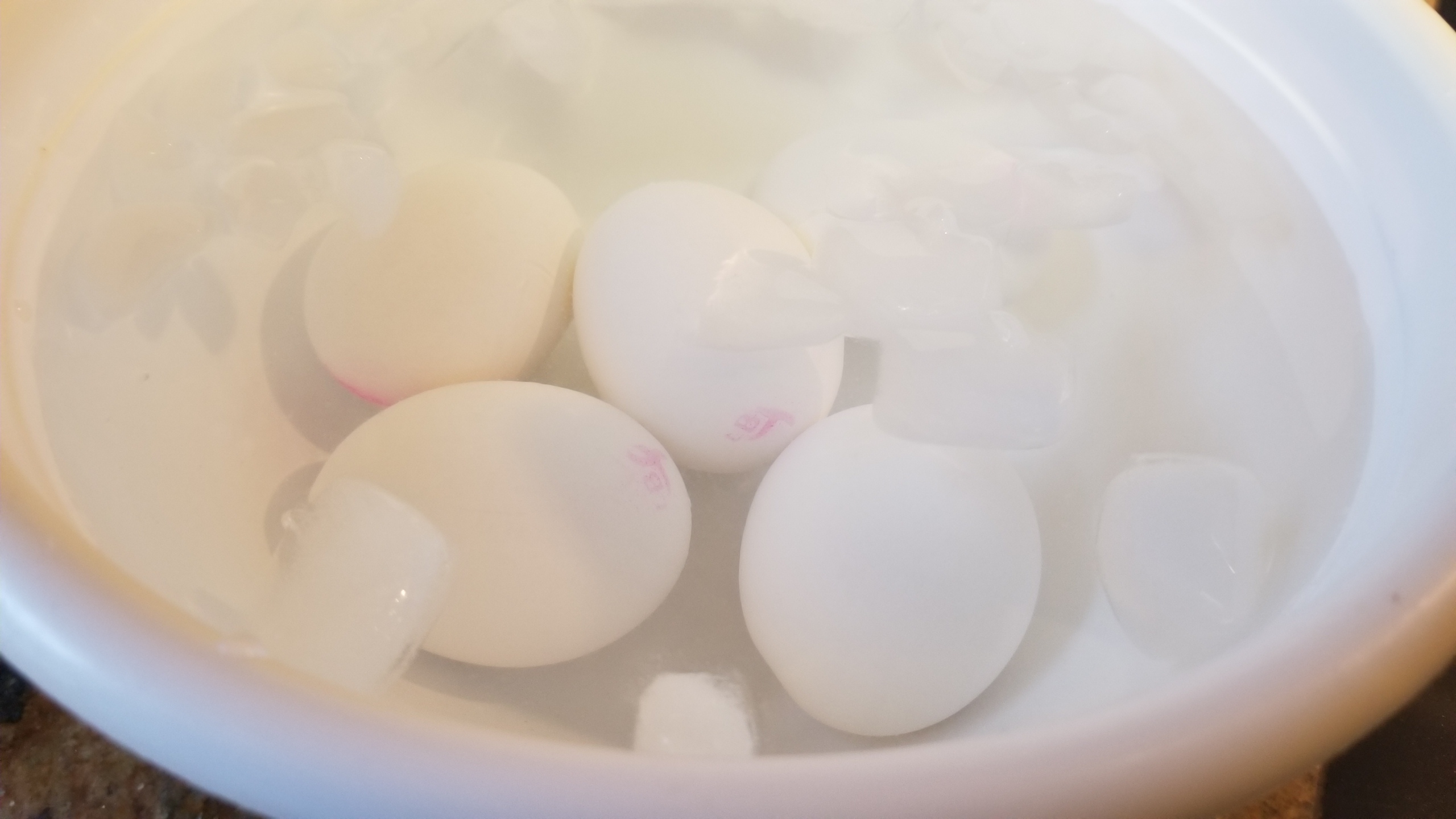At this point, the eggs are either rinsed in cold water or placed in an ice bath until cool.