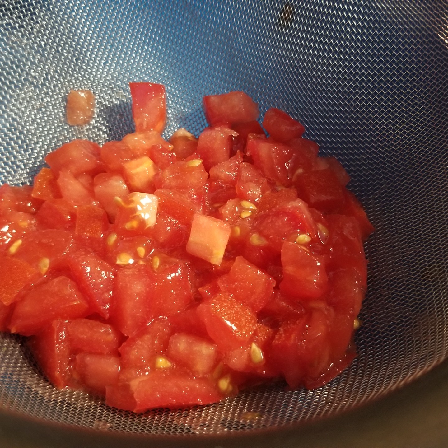 The tomatoes are chopped first, tossed with salt, and left to strain over a bowl. The bacon is then cooked, followed by bread crumbs in the bacon grease, followed by the now chopped bacon. Finally, the bacon is cooked with brown sugar.