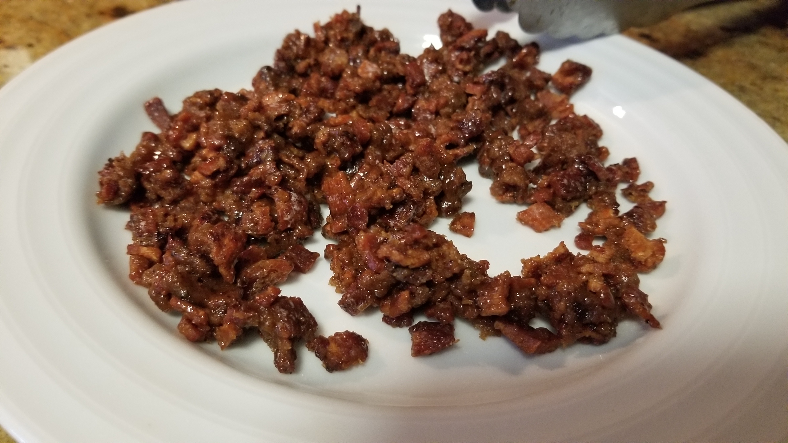 A couple things to note – the recipe forgets to tell you to chop the bacon, it just suddenly says “add the finely chopped bacon…” Also, when the candied bacon cools it sticks together like crazy!