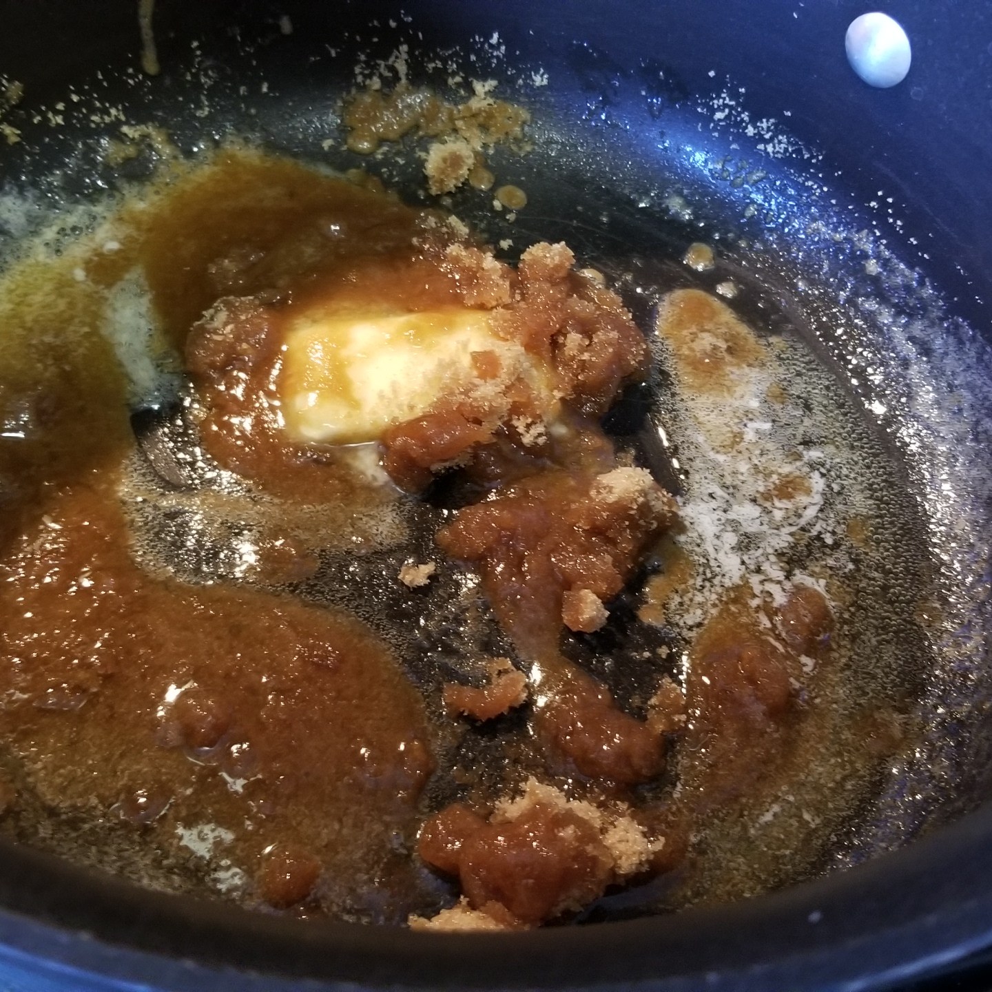 The chopped apples are cooked first, and then removed before heating and combining the rest of the filling ingredients over the stove to make a caramel. The apples are then stirred into the caramel along with some cinnamon.