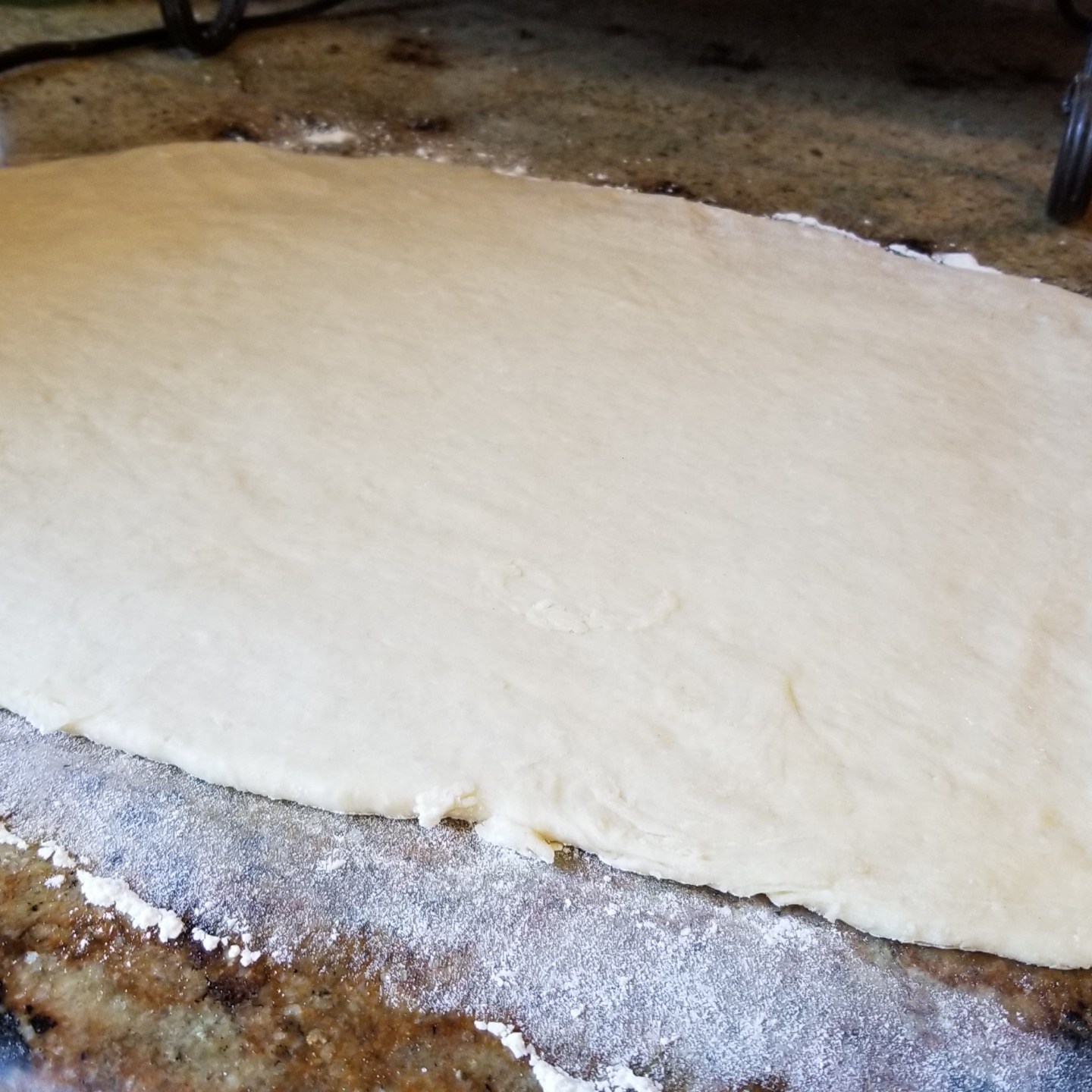 The dough is then rolled out and the filling is spread over the dough. The dough is rolled up and sealed.