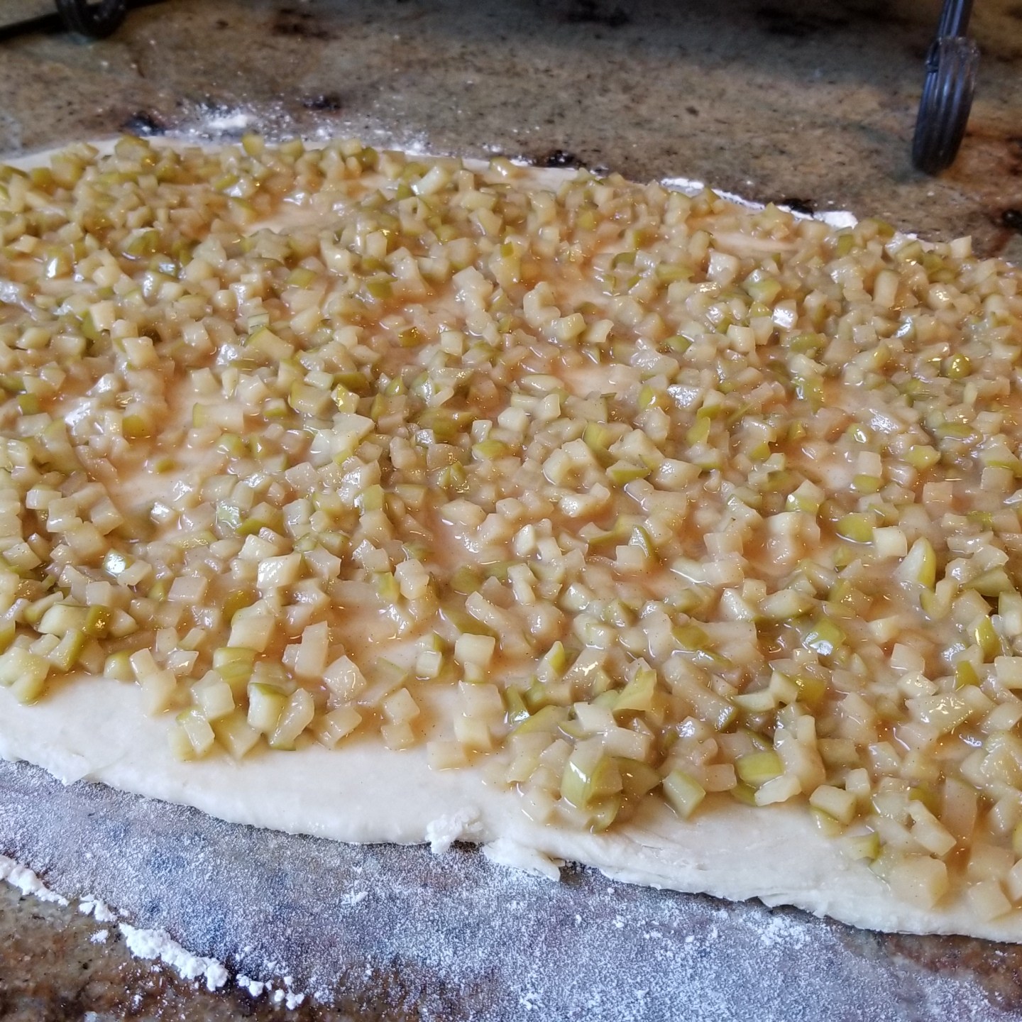 I found the filling to be too runny. I cooked it as long as the recipe said, but I think it needed longer. I ended up leaving a lot of the liquid inside the bowl rather than adding it to the dough, but made sure all the apples ended up on there. The liquidity of the filling also made it tough to seal the dough at the end, since it kept seeping out of the side. Eventually I made it work, though!