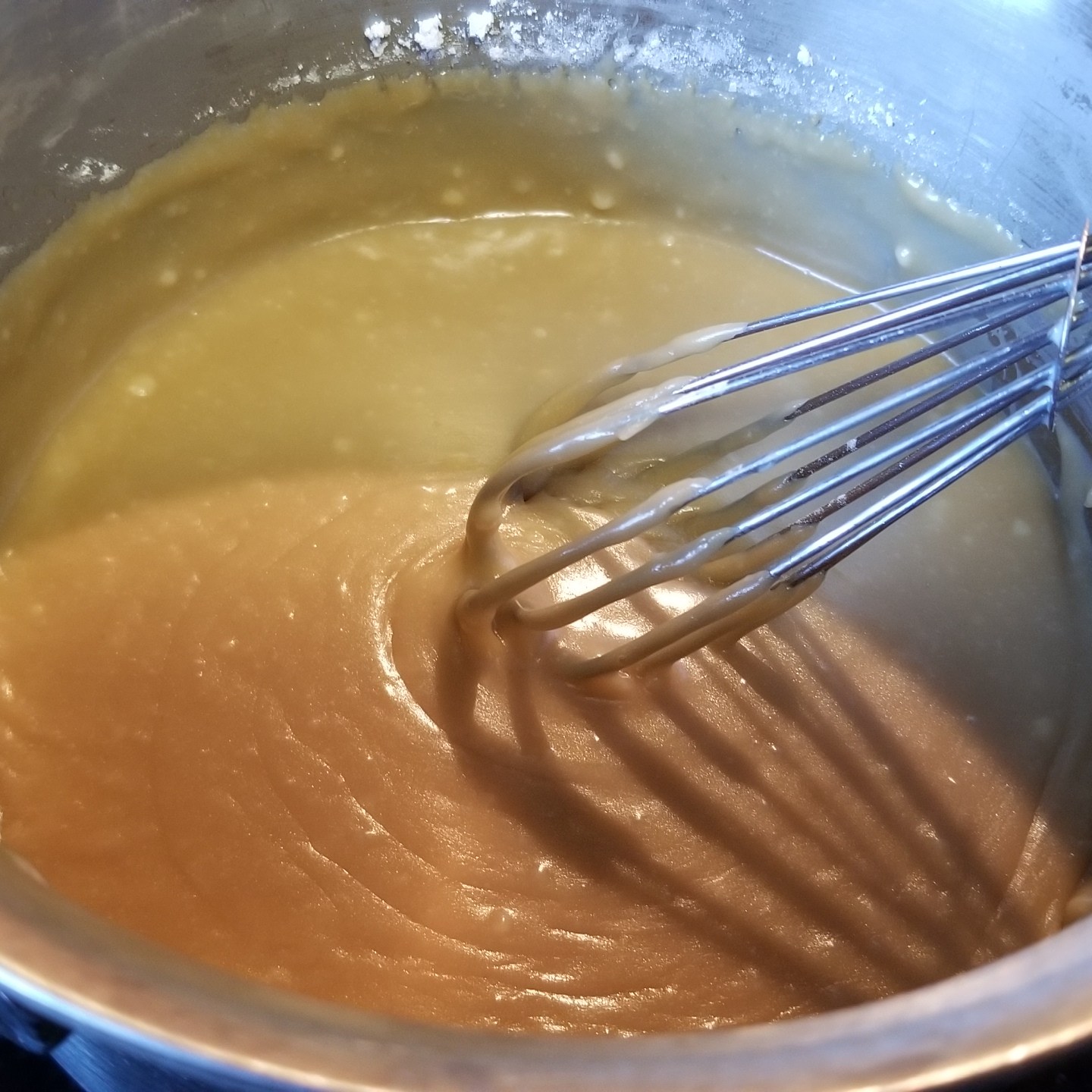 While they cook, the icing topping is prepared by cooking all ingredients except the powdered sugar over the stove, and then mixing in the powdered sugar at the end. This is spread over the warm buns as they come out of the oven.