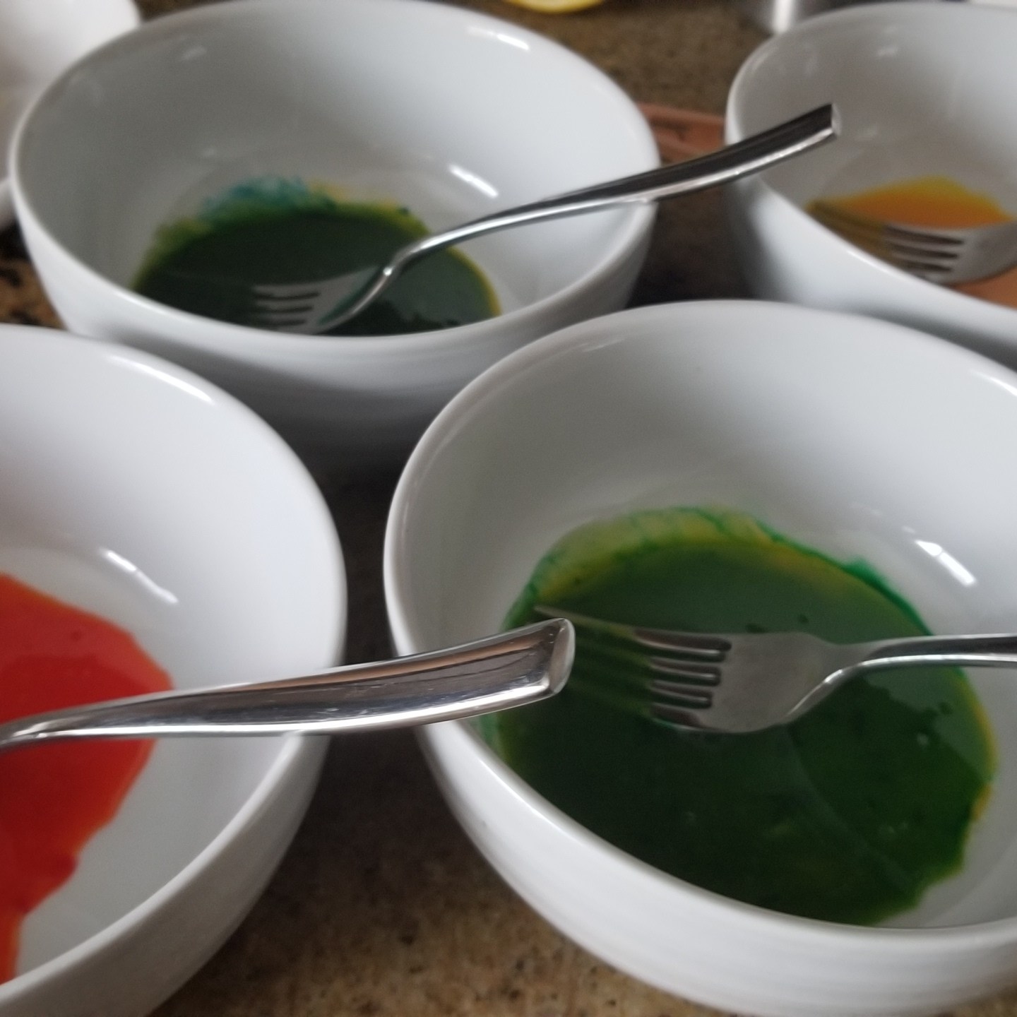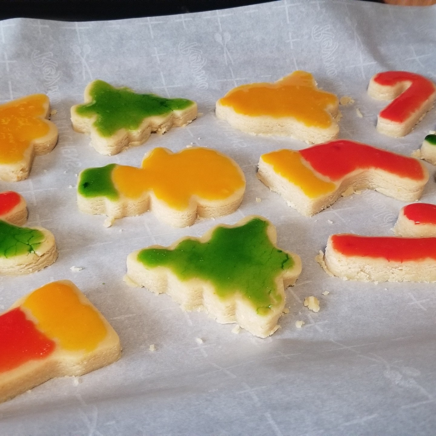 Once ready, the dough is rolled out and cut with cookie cutters. For the coloring on top, egg yolk is mixed with food coloring and painted onto the cookies with a paintbrush. Then the cookies are baked until the glaze sets.