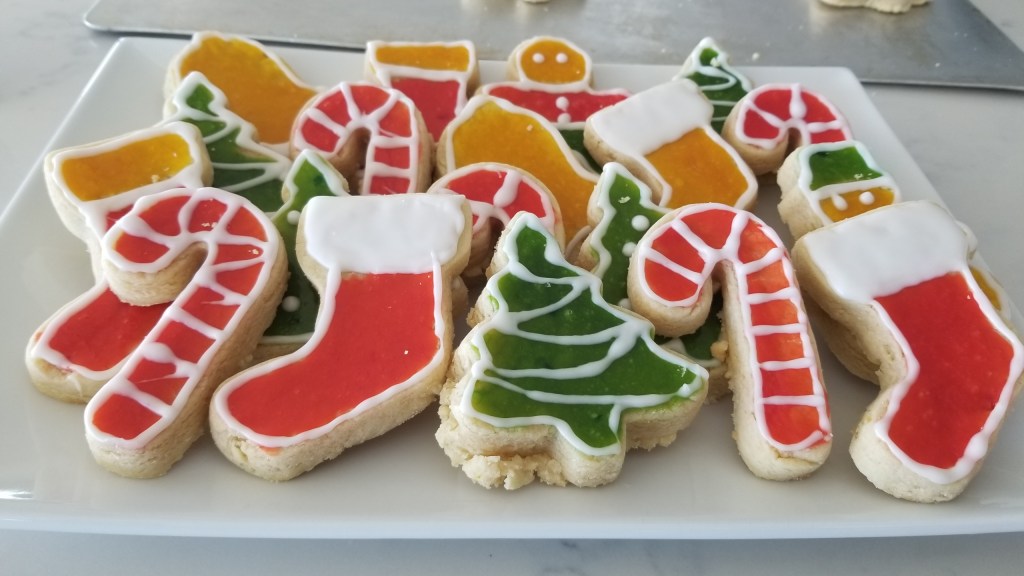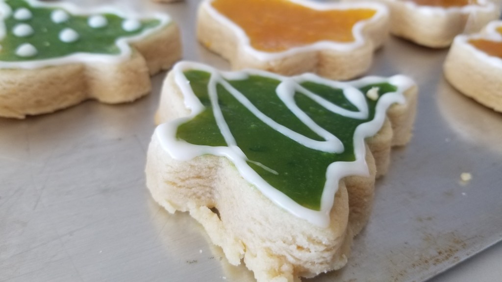 When the cookies are cool, it’s ready to ice them! I actually froze my cookies first, and then thawed them and finished icing them at my parents’ place. The icing ingredients are combined and piped onto the cookies through a pastry bag or, if you’re like me, a ziploc with the tip snipped off. The icing adds outlines and details to the cookies.