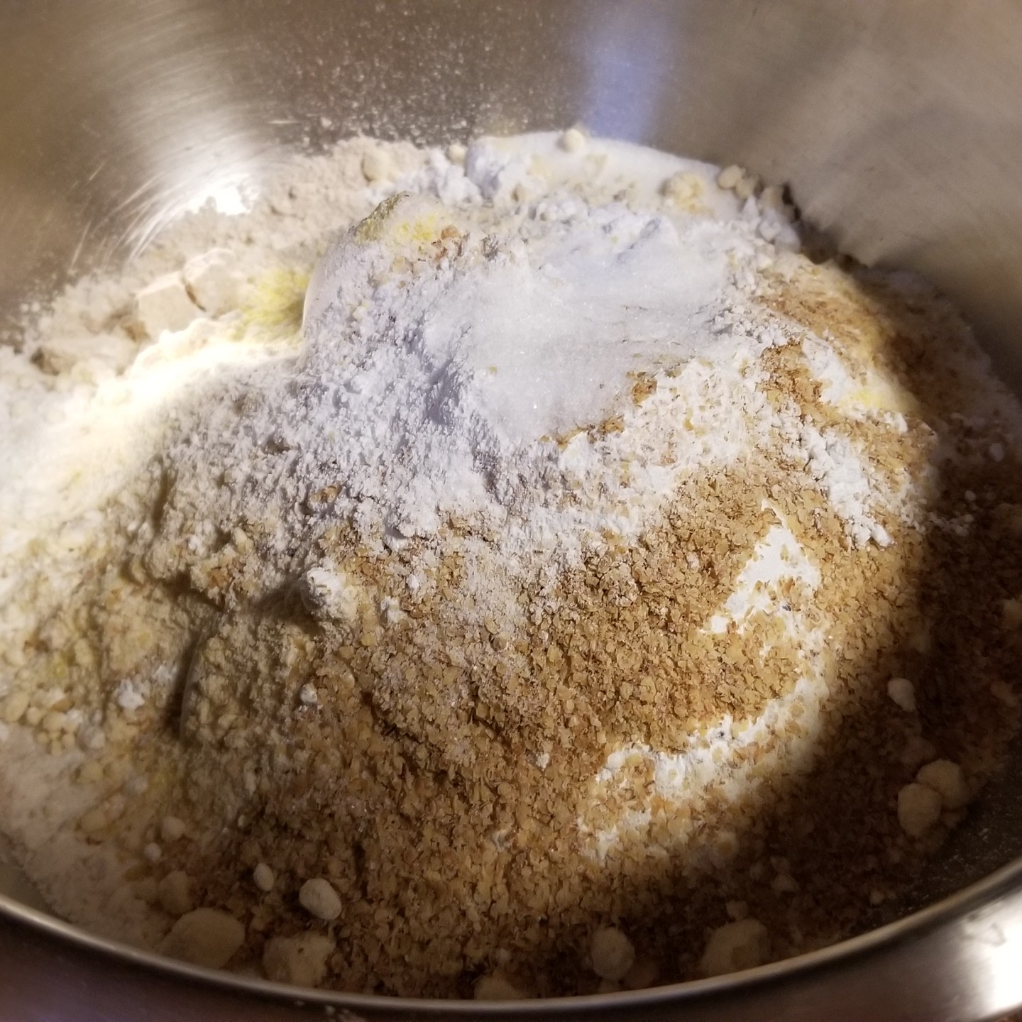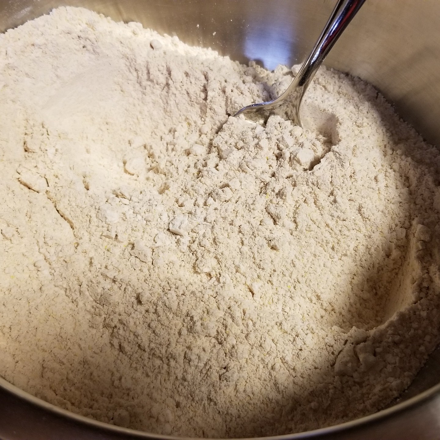 Ingredients include all-purpose flour, whole wheat flour, spelt flour, yellow cornmeal, sugar, malted milk powder, baking powder, toasted wheat germ, salt, milk, walnut oil, vanilla extract, and egg. And of course your topping of choice!