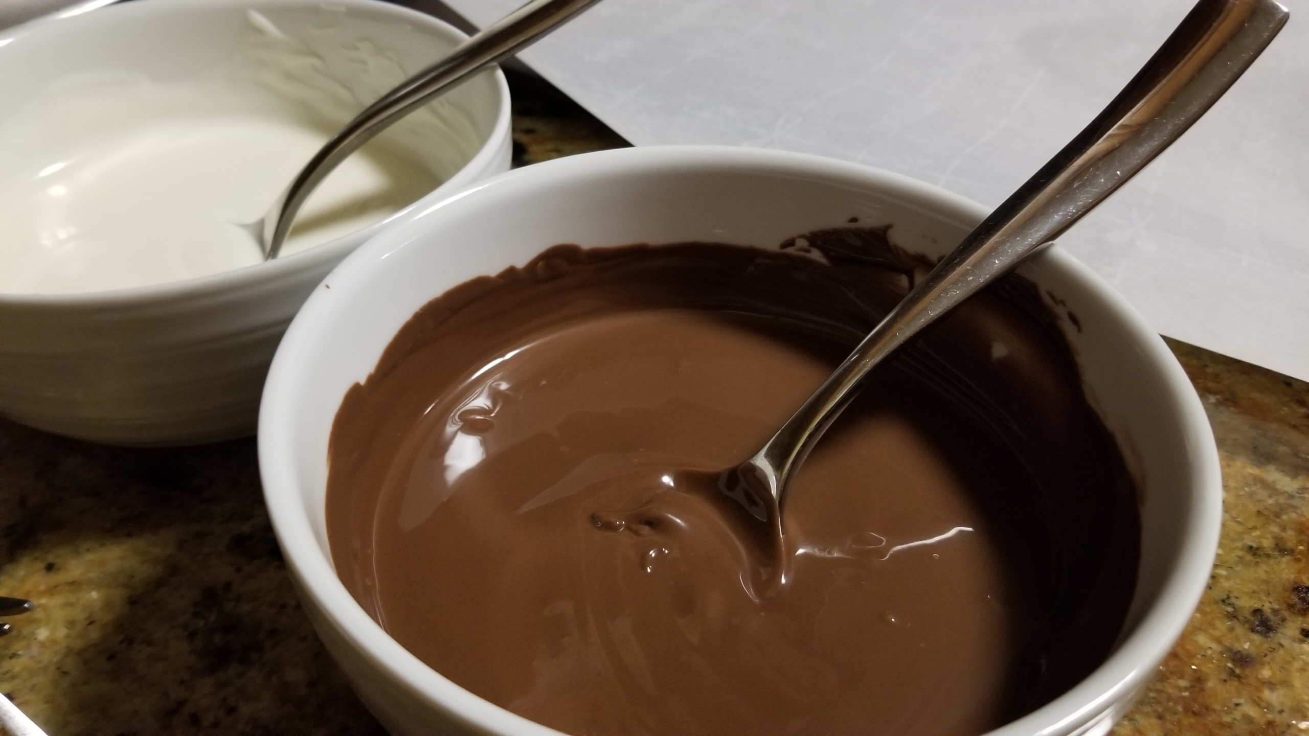 Meanwhile, the almond bark is melted (both chocolate and vanilla).
