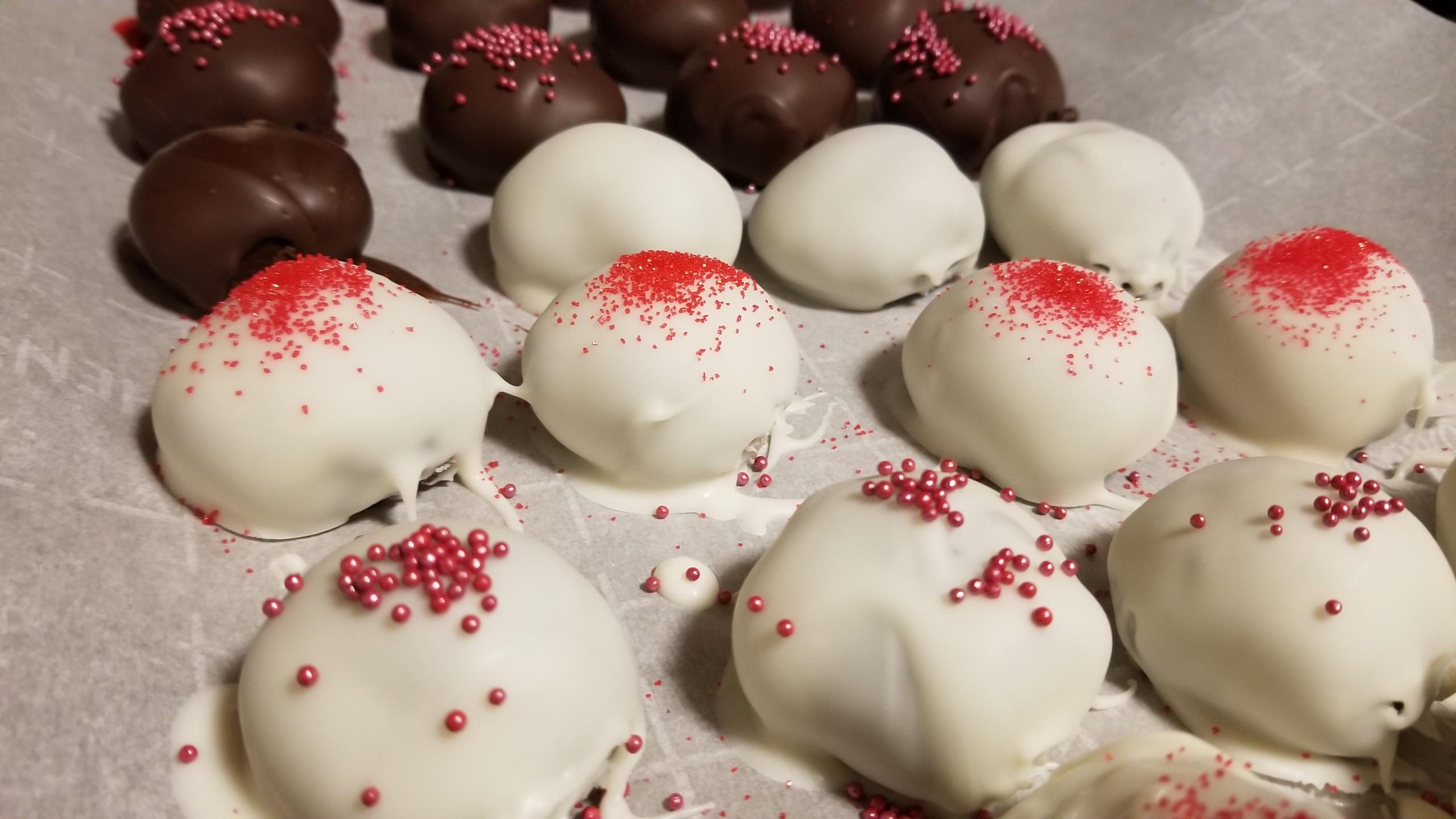 Finally, the frozen balls are dropped into the almond bark and sprinkled with sprinkles. Be sure to work quickly, because the almond bark hardens fast!