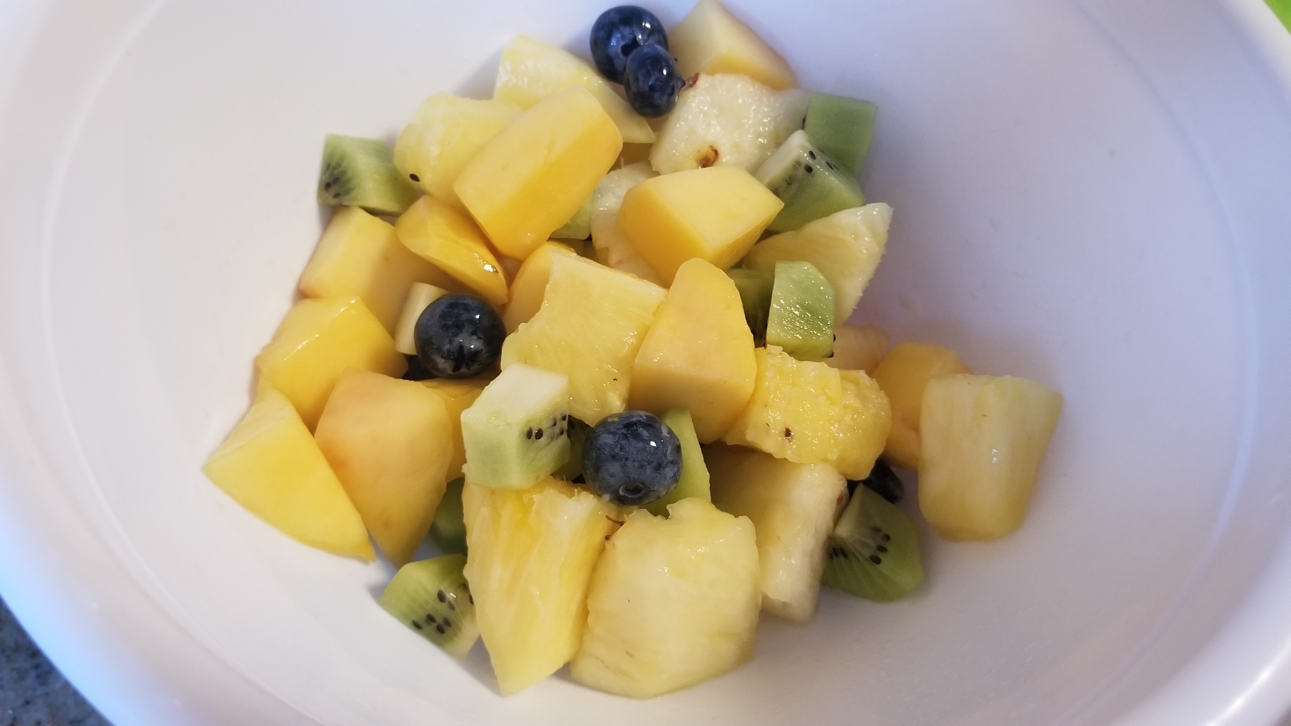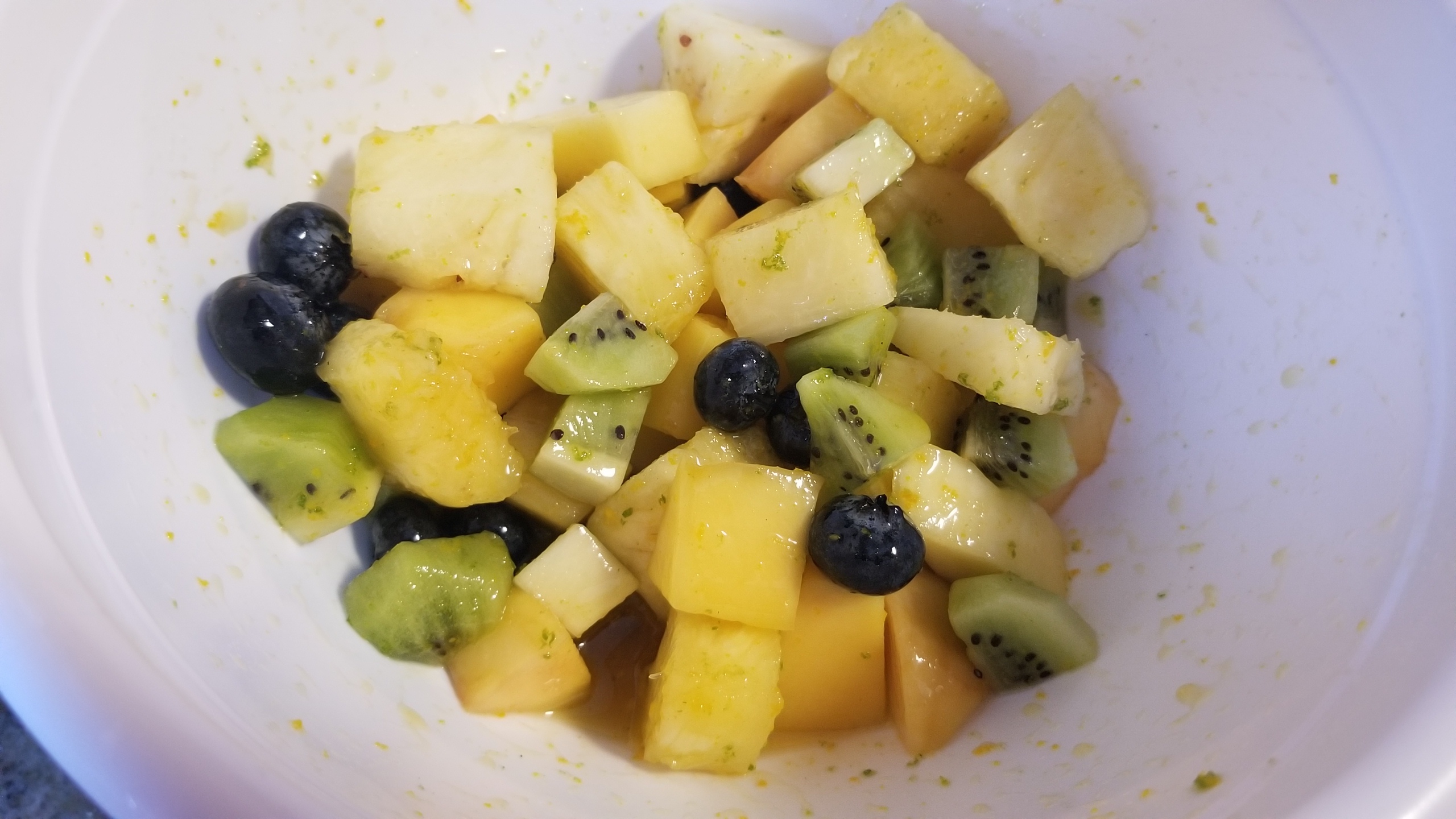 Meanwhile, the fruit are chopped and combined in a large bowl.