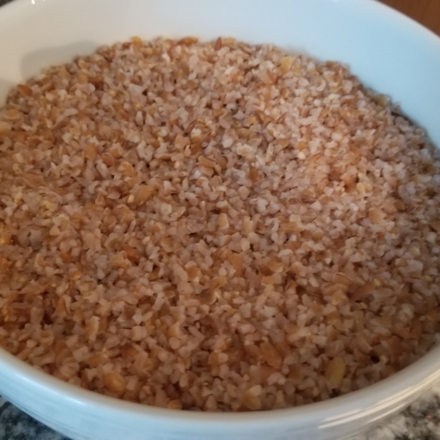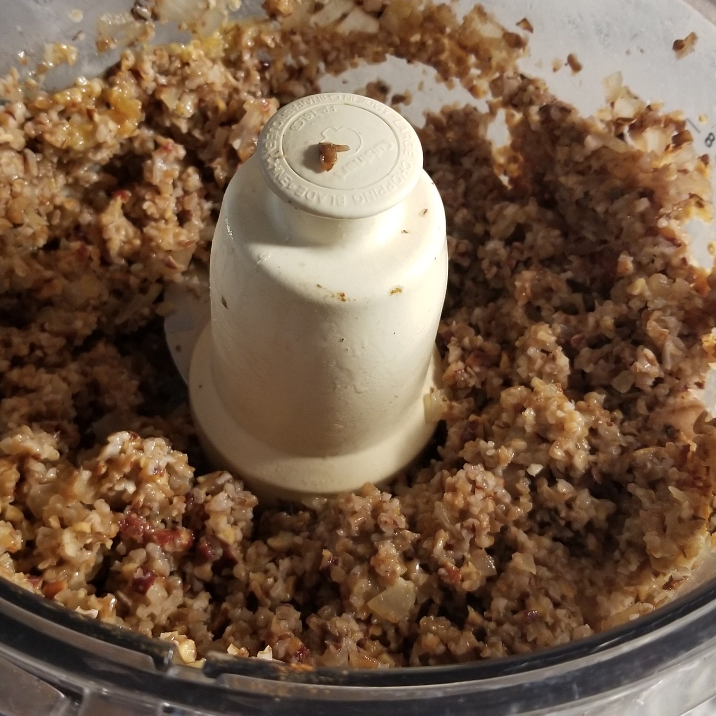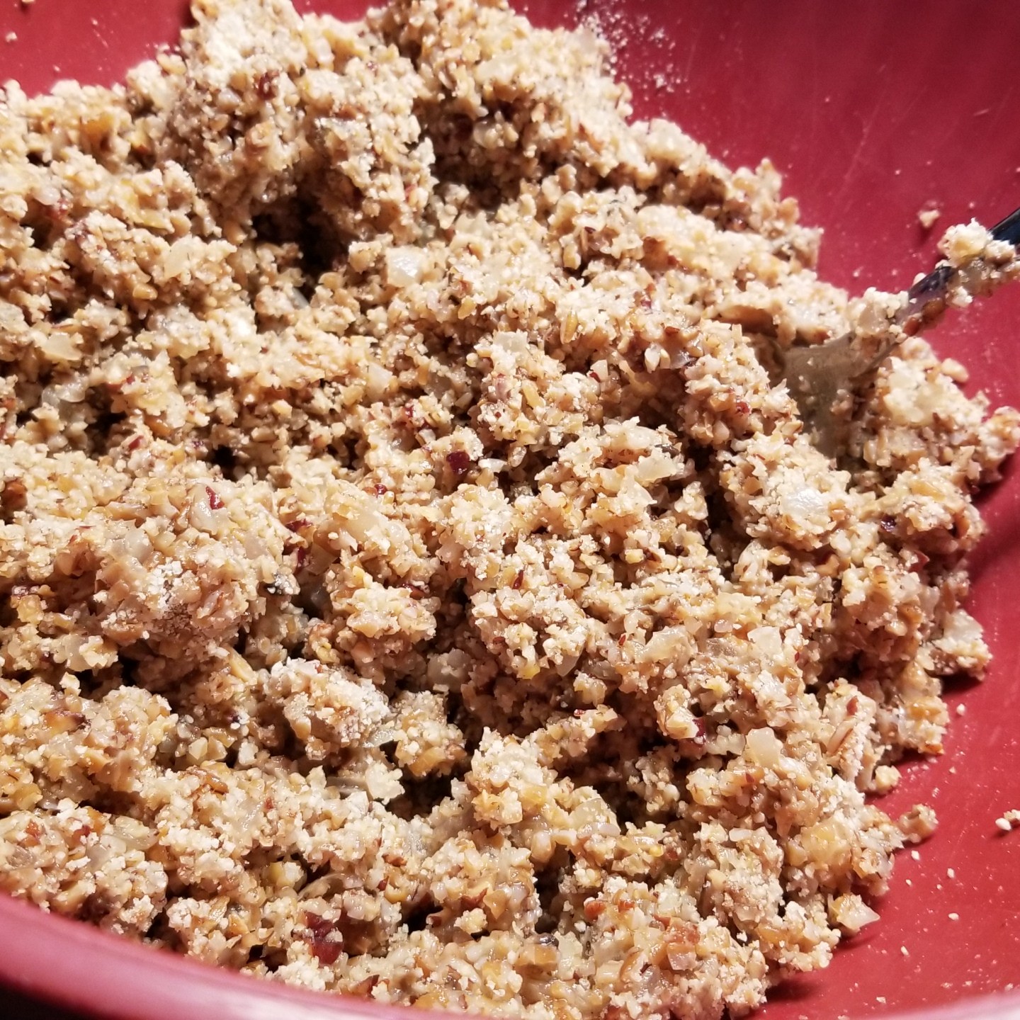 Boiling water is poured over top of bulgur wheat and salt, and left to absorb. While that happens, I chopped up mushrooms, onions, and pecans, and roasted the pecans. When the bulgur wheat is ready, extra water is drained out.