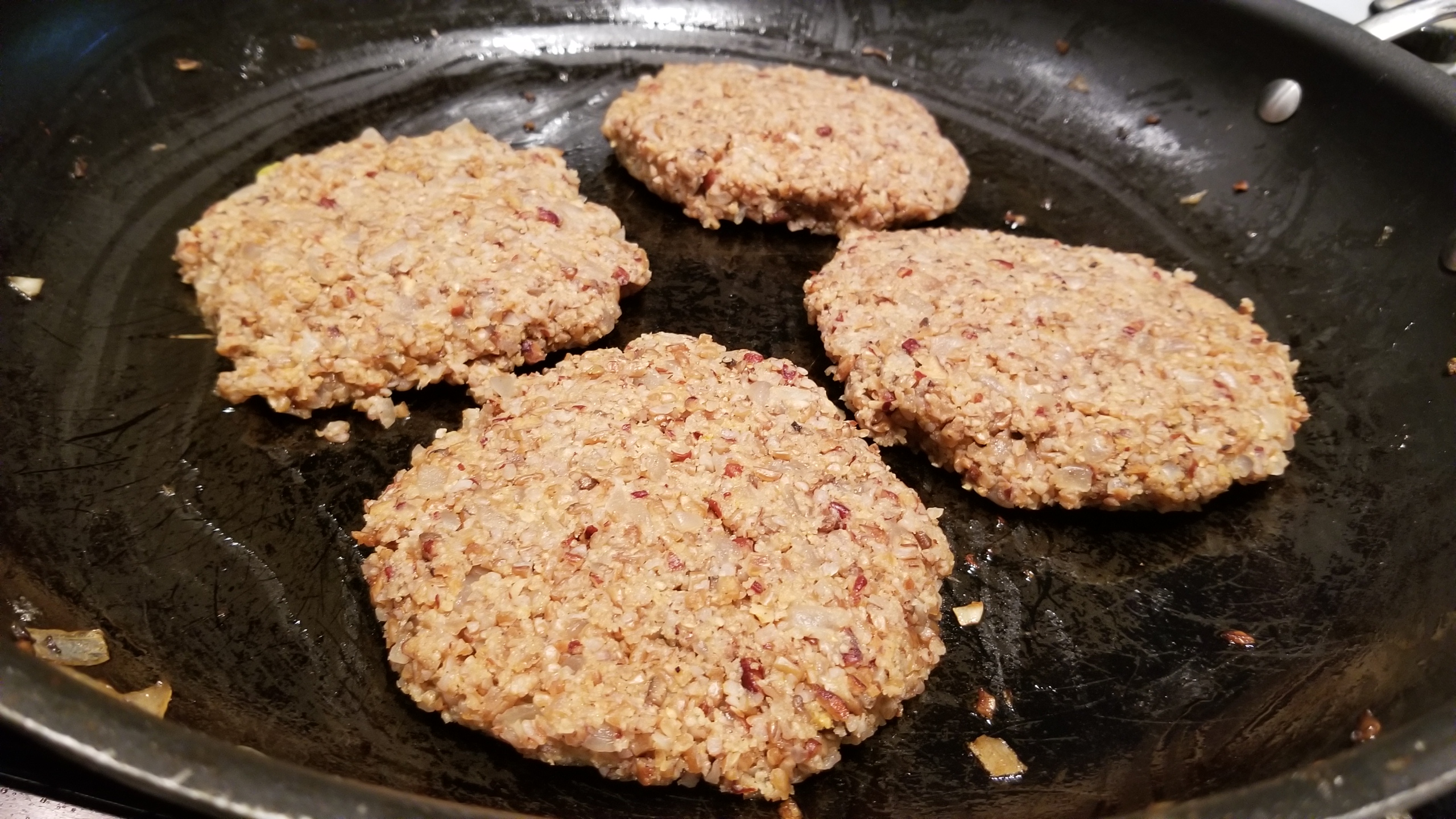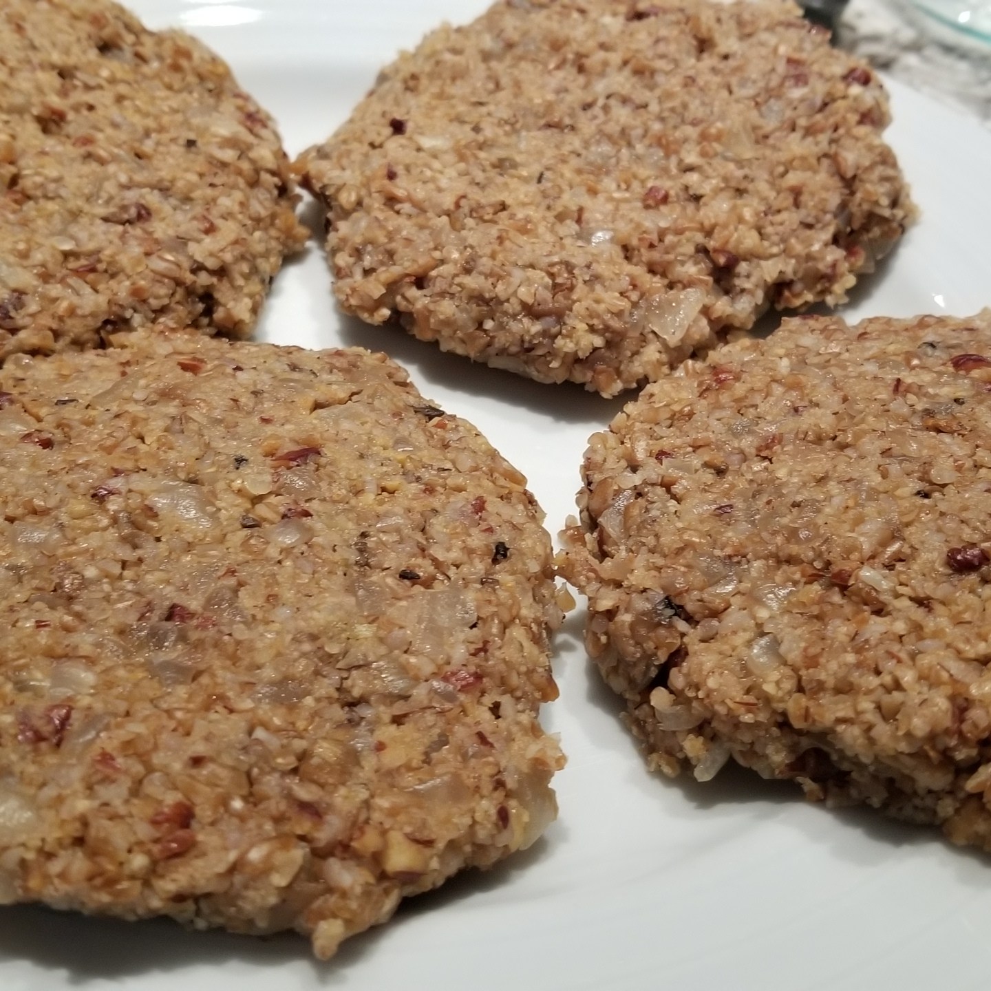 The pecans and veggies are tossed in a food processor and pulsed a few times until mixed. Then egg and the bulgur wheat are added in and it’s pulsed again. This is all then mixed with bread crumbs, seasoned with cayenne and Tabasco (don’t be stingy with the Tabasco! other wise this would taste a bit bland), and formed into burger patties.