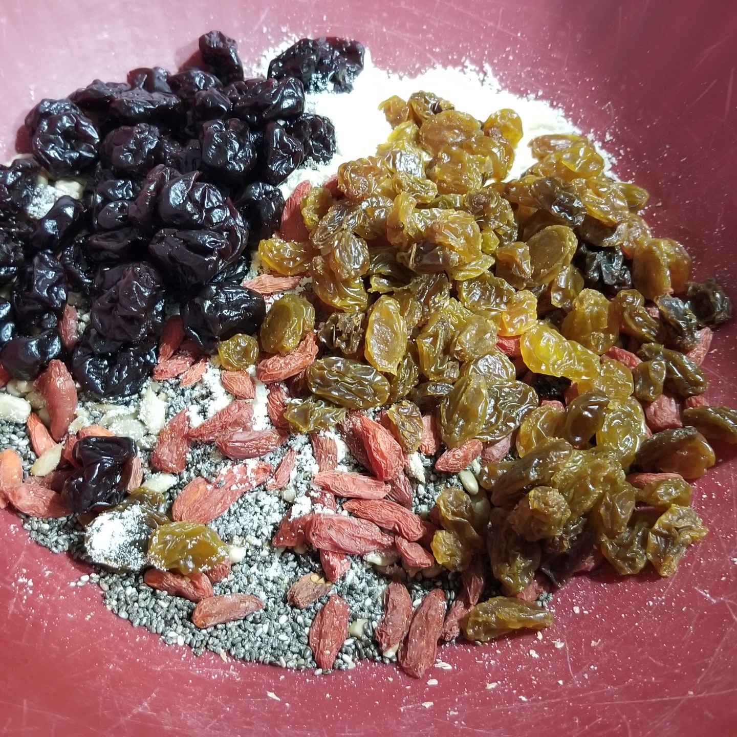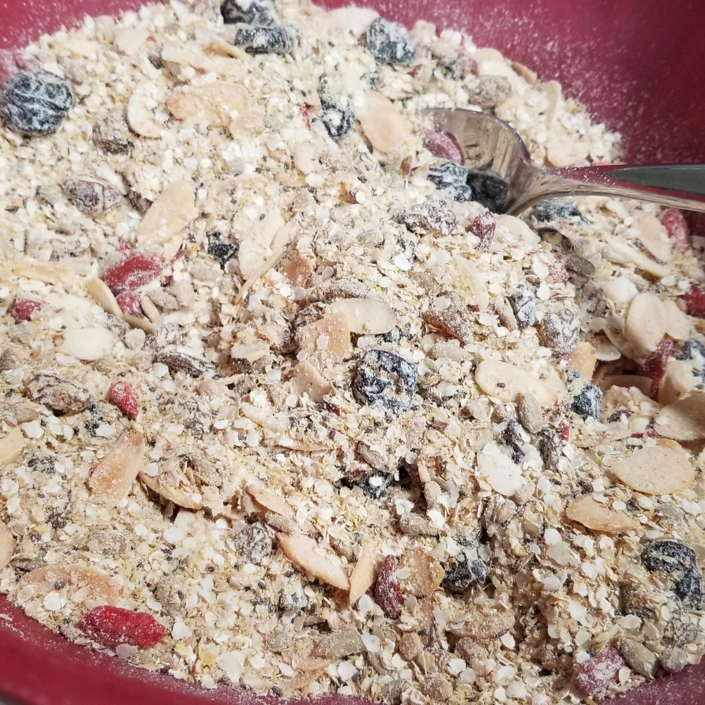 First, quinoa flakes and sliced almonds are roasted in the oven, and then they’re mixed with a bunch of other seeds, dried fruit, wheat germ, and protein powder.