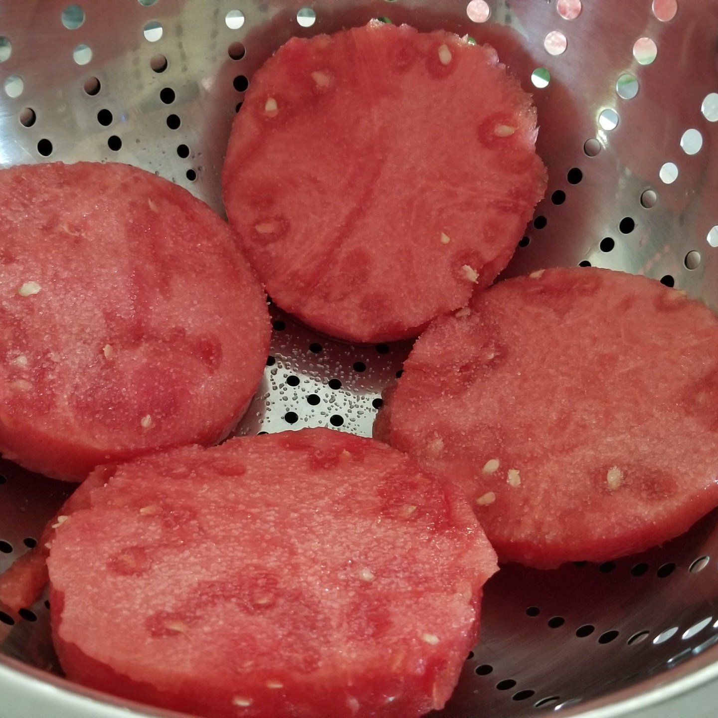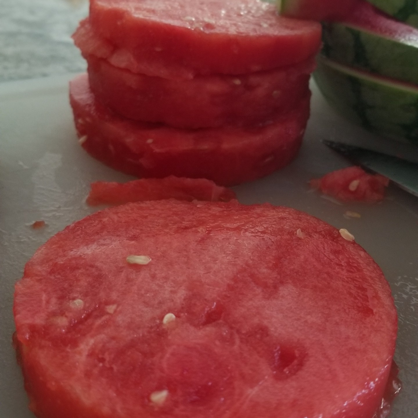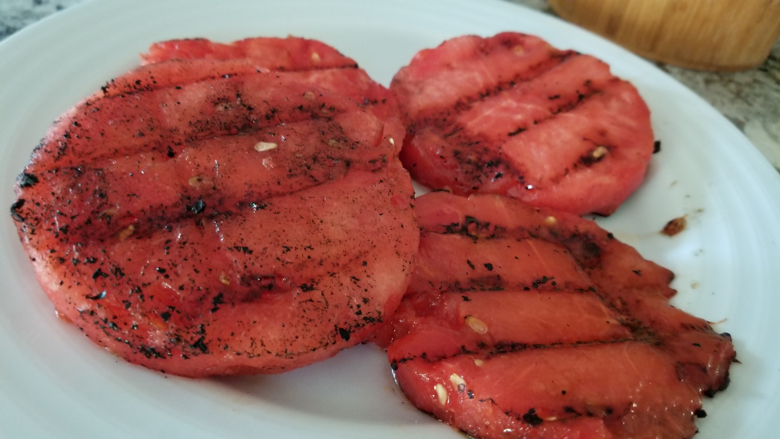 The watermelon slices were rinsed, dried, and then thrown on the grill along with the patties. The patties were a bit crumbly and challenging to flip.