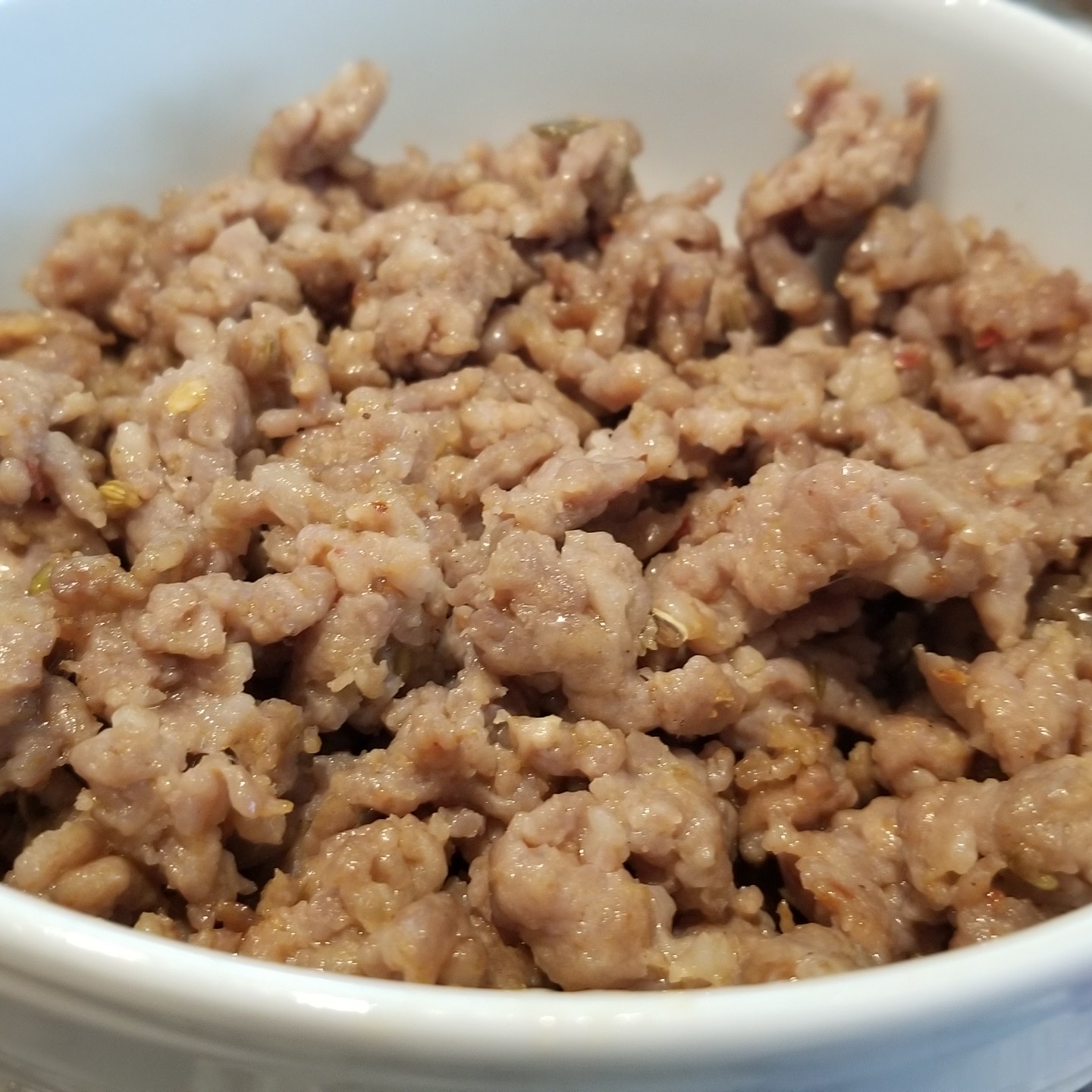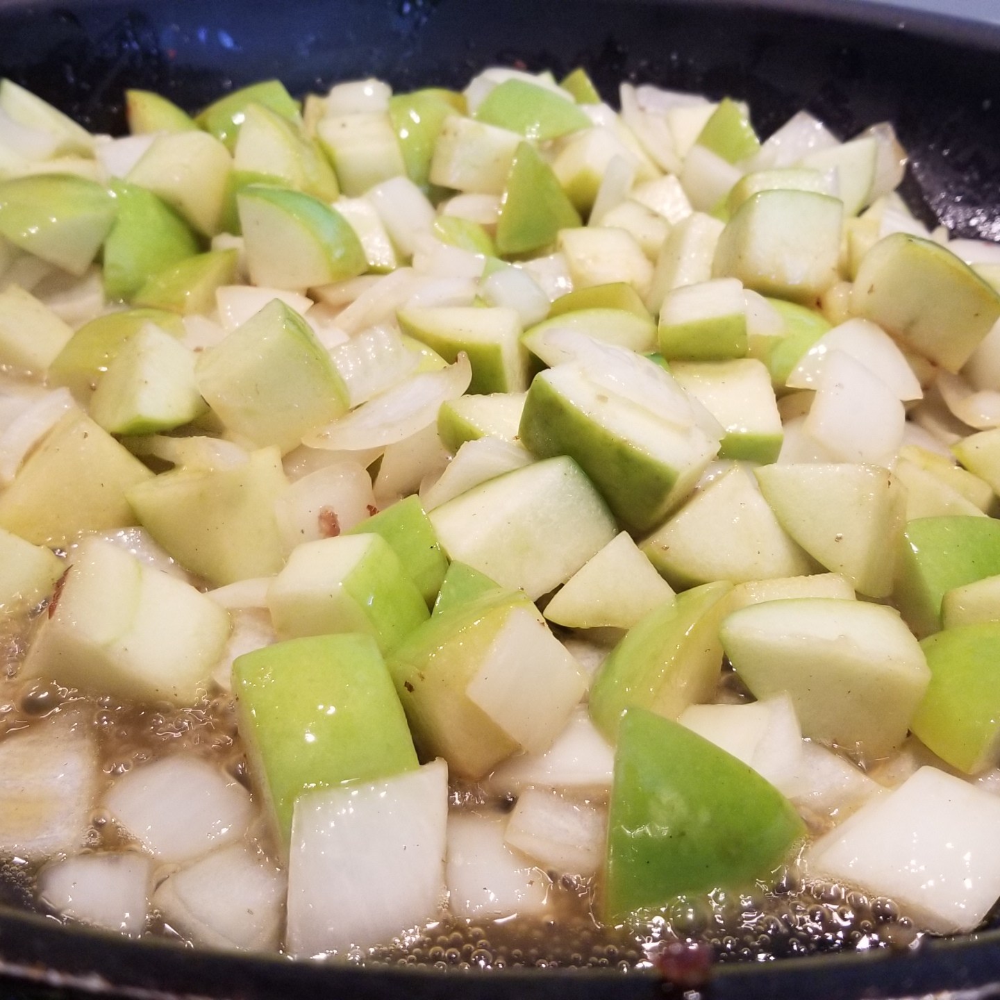 The meat was browned and set aside, followed by cooking the apples with onion, brown sugar and wine. The apples are tossed with the cubed bread.