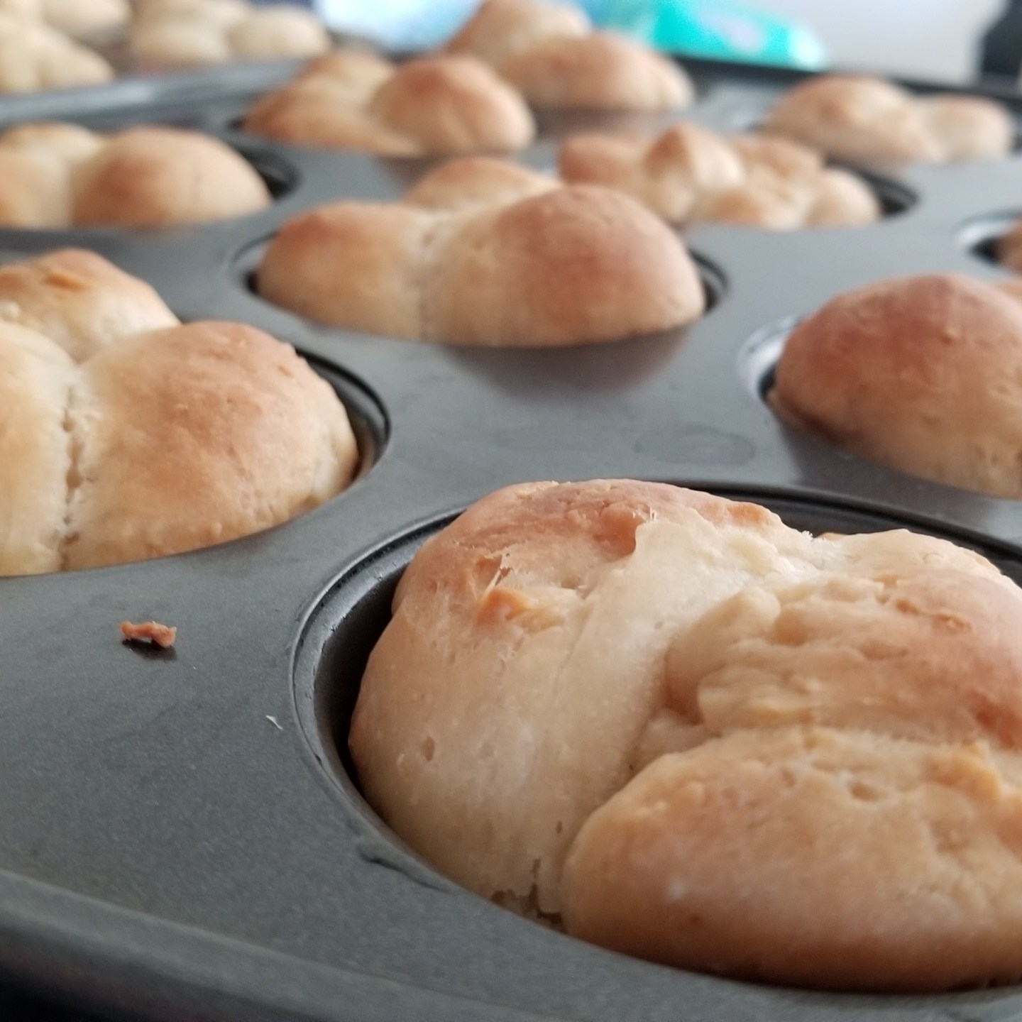 I got the rolls ready about 2 hours before I cooked them. After adding a little melted butter to each of the muffin cup, the dough is pinched off and rolled into small balls. The recipe doesn’t specify the size of the balls, which I found a little frustrating, but eventually I figured it out. Three balls are added to each muffin cup, and left to rise.